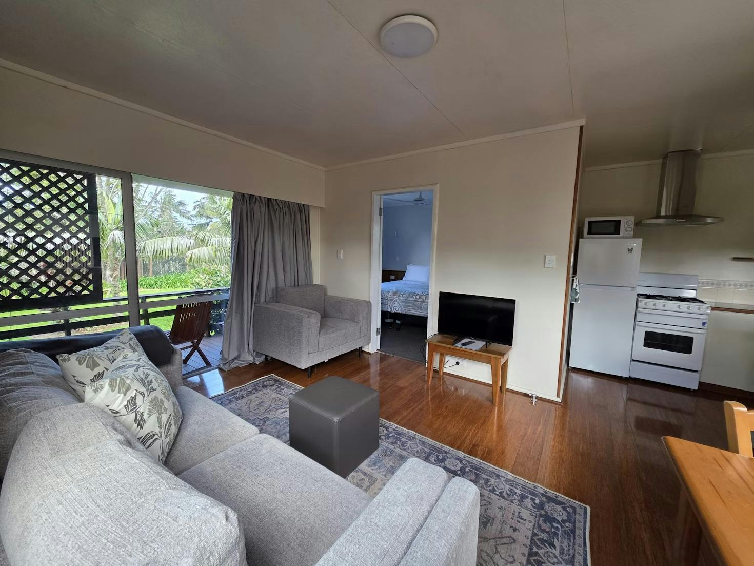 This apartment is in a sunny and private location, close to the swimming pool. It includes a living room with a digital TV, a compact but full kitchen, a separate bedroom with an ensuite bathroom. Guests will find a refrigerator, oven, airfryer, microwave and a toaster in the kitchen. The apartment also has access to a shared BBQ pavilion. There are views of Mount Pitt from the lounge room, and peaceful garden views from the private back veranda. The unit has 1 king size bed.
